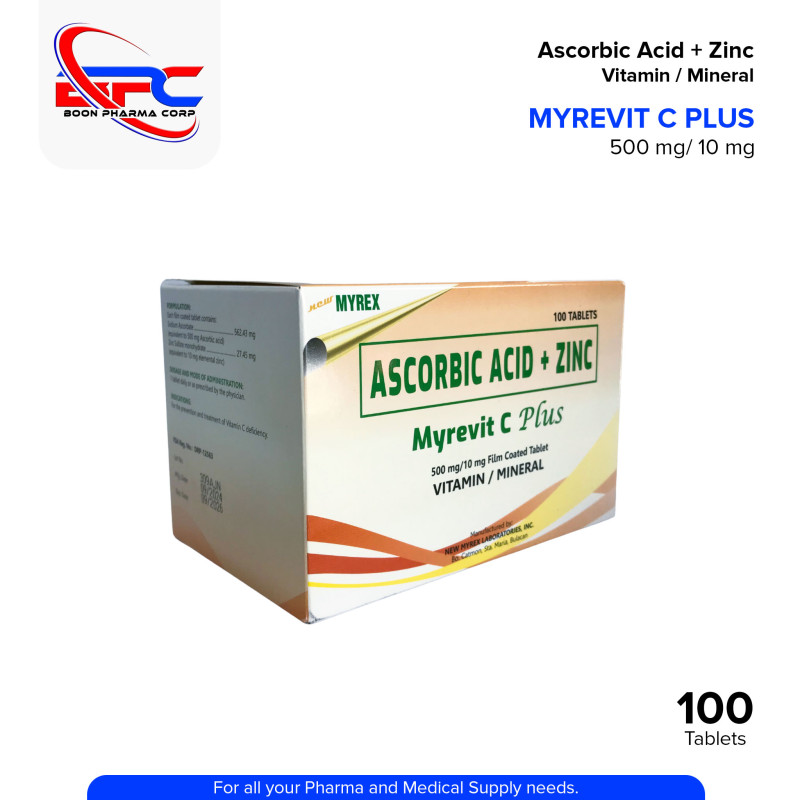 MYREVIT C PLUS (Ascorbic Acid + Zinc) is a vitamin and mineral supplement that supports immune function, helps fight oxidative stress, and promotes faster recovery from infections. It is ideal for boosting daily immunity and overall wellness.