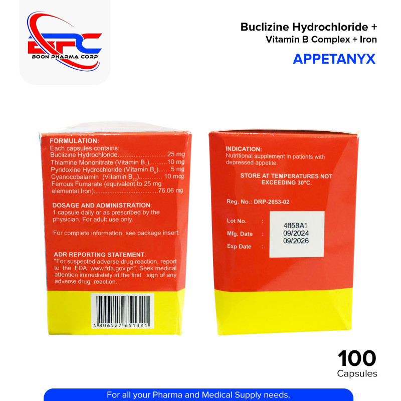 APPETANYX is a multicomponent supplement combining Buclizine Hydrochloride, Vitamin B Complex, and Iron. It is commonly used to stimulate appetite, support growth and development, prevent nutritional deficiencies, and manage fatigue. Ideal for individuals with poor appetite, undernutrition, or recovering from illness.