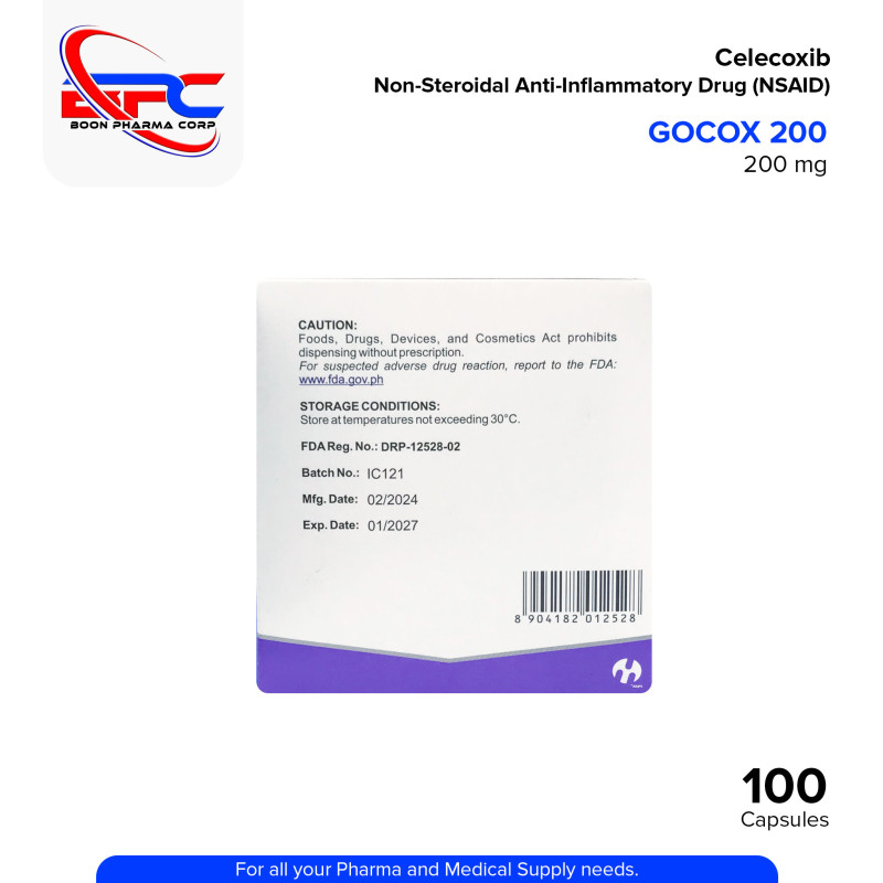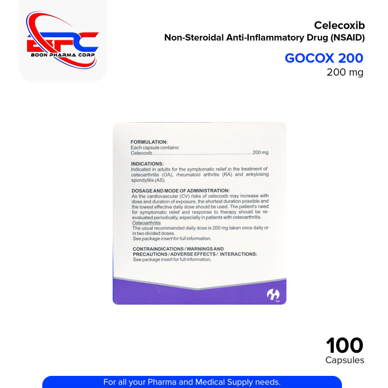 GOCOX 200 Celecoxib 200 mg Capsule is a selective COX-2 inhibitor (NSAID) designed to help support relief from pain and inflammation associated with osteoarthritis, rheumatoid arthritis, and acute musculoskeletal conditions. By selectively blocking COX-2, it reduces pain and swelling while minimizing gastrointestinal side effects. Always consult your healthcare professional before use.