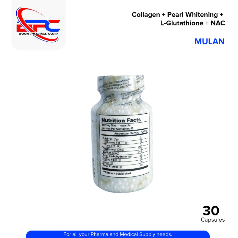 MULAN is a skin-enhancing food supplement combining Collagen, Pearl Powder, L-Glutathione, and N-Acetylcysteine (NAC). It is formulated to promote skin whitening, improve elasticity, reduce signs of aging, and detoxify the body. Taken daily, MULAN supports a brighter, clearer, and healthier complexion from within.