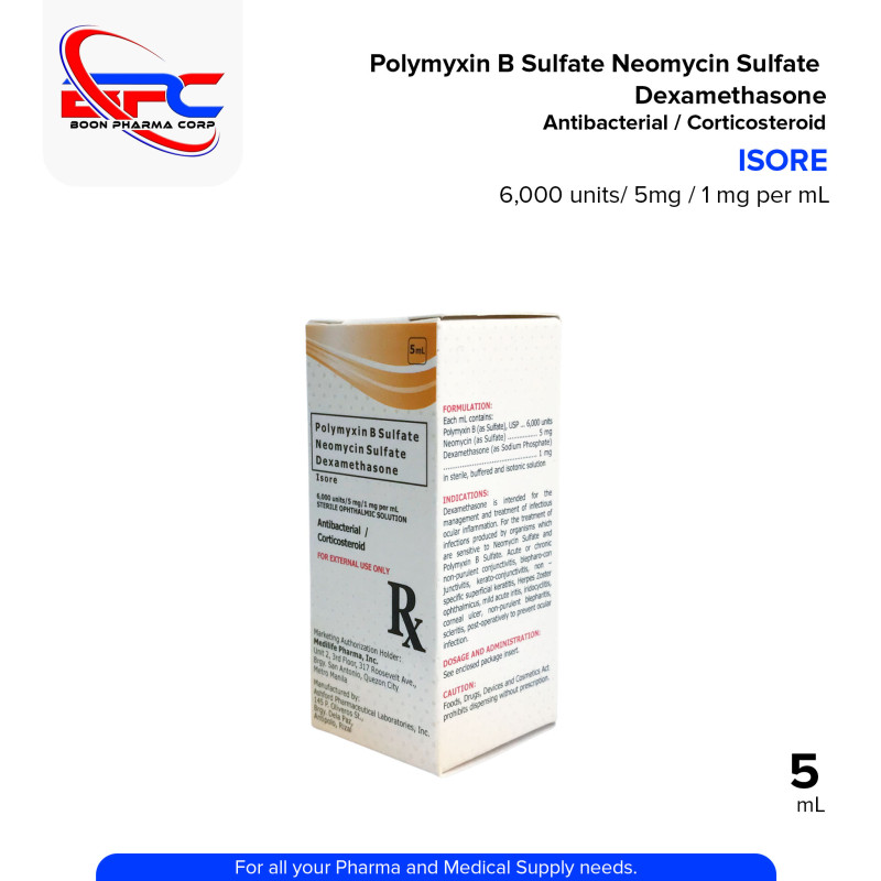 Polymyxin B Sulfate + Neomycin Sulfate + Dexamethasone (Isore) 6000 Units/ 5mg/ 1mg per ml Sterile Opthalmic Solution 5ml