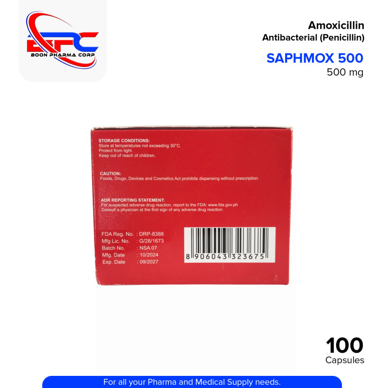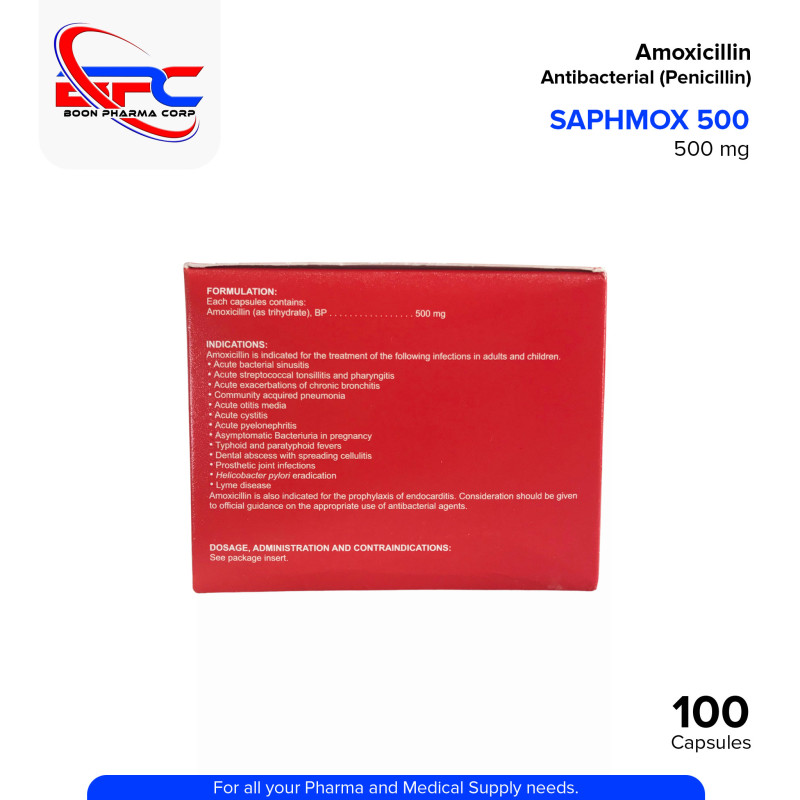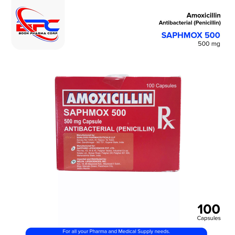 SAPHMOX Amoxicillin 500mg Capsule is a penicillin-type antibacterial product used to support the treatment of various bacterial infections affecting the respiratory tract, urinary tract, skin, and more. It helps manage and control bacterial growth when taken as prescribed by a healthcare professional.