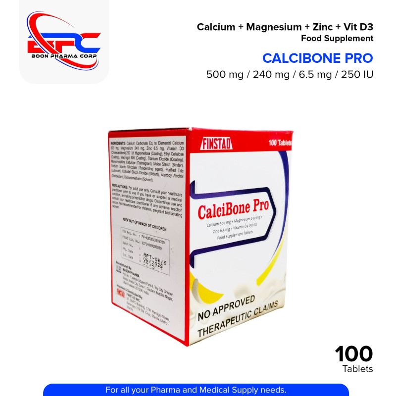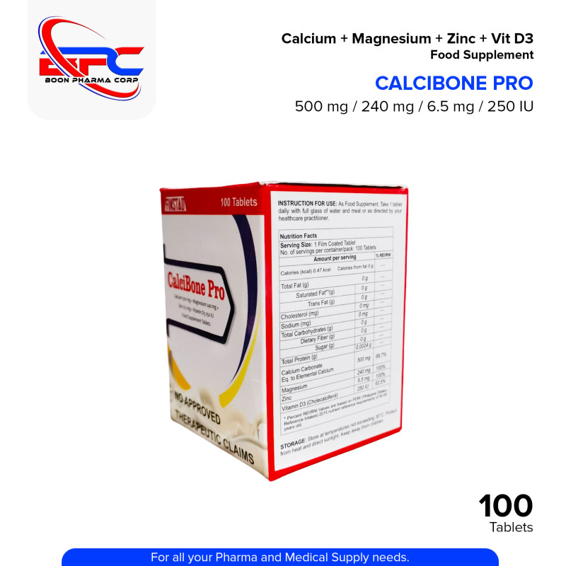 CALCIBONE PRO is a food supplement formulated with Calcium, Magnesium, Zinc, and Vitamin D3 to support bone strength, improve calcium absorption, and promote overall musculoskeletal health. This combination also helps enhance immunity, metabolism, and proper muscle function.