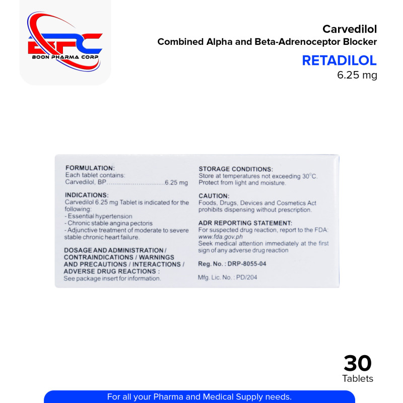 Carvedilol (Retadilol) 6.25mg Tablets, 30's is a medication used to treat high blood pressure (hypertension), heart failure, and to improve recovery after a heart attack. Each tablet contains 6.25mg of carvedilol, a beta-blocker and alpha-blocker that helps by lowering heart rate, reducing blood pressure, and improving blood flow. It works by blocking certain receptors in the heart and blood vessels, thereby reducing the strain on the heart. The 30-tablet pack is typically used as part of a long-term treatment plan under the supervision of a healthcare provider.