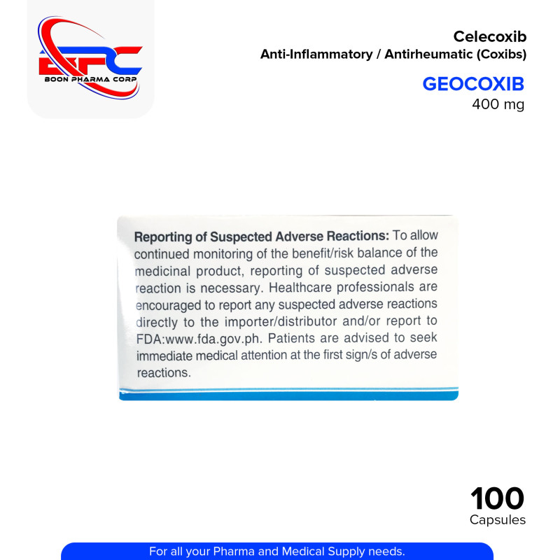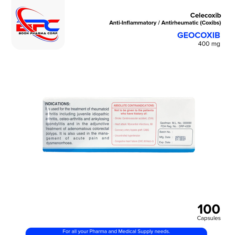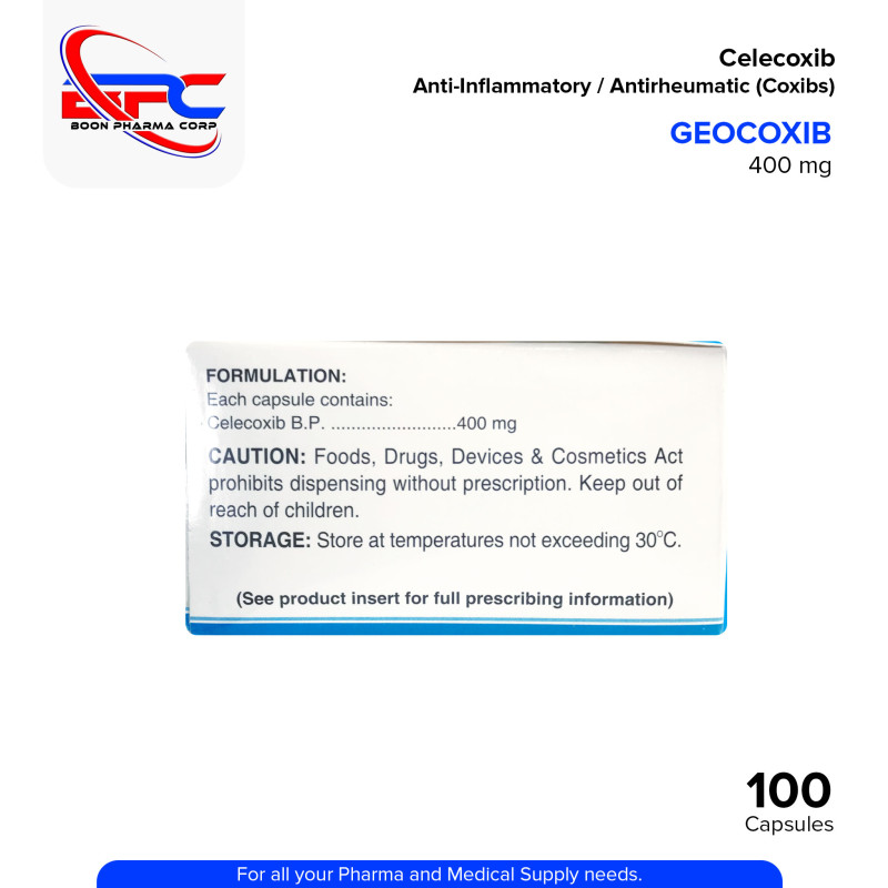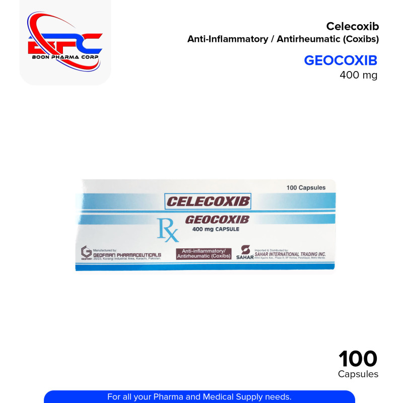 GEOCOXIB Celecoxib 400 mg Capsule is a selective COX-2 inhibitor (Coxib) used to help support relief from pain and inflammation associated with osteoarthritis, rheumatoid arthritis, and acute musculoskeletal conditions. It works by reducing inflammation and pain without significantly affecting gastrointestinal protection. Always consult your healthcare professional before use.