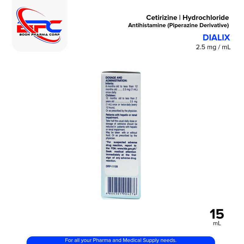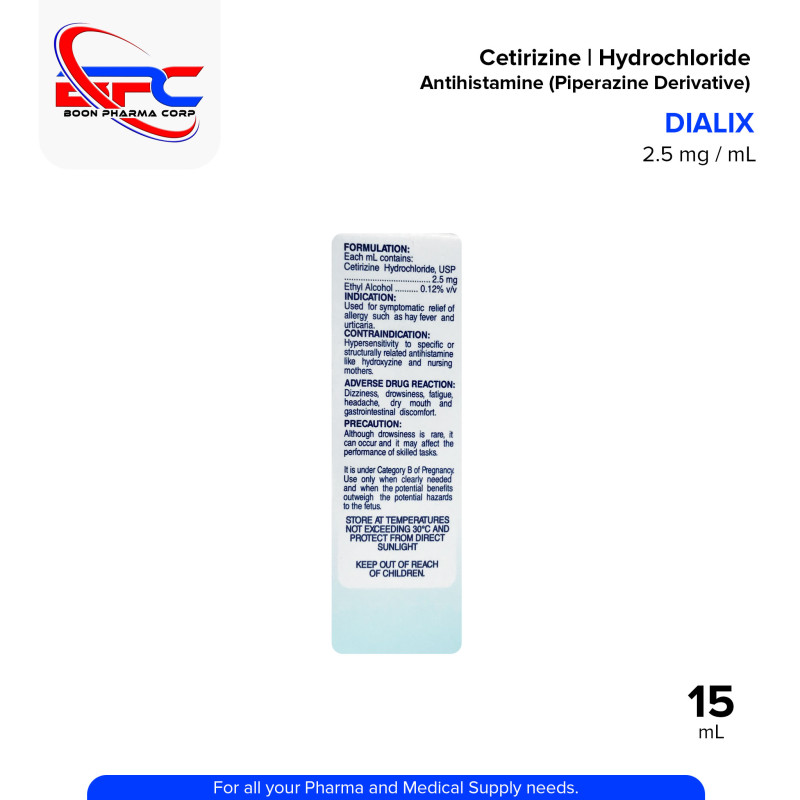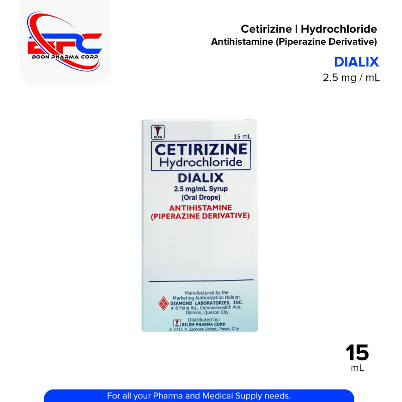 DIALIX Cetirizine Hydrochloride 2.5 mg / mL Oral Drops is a second-generation antihistamine in a piperazine derivative formulation. It is used to treat allergic rhinitis, urticaria, and other allergic conditions in infants and young children. The non-drowsy formula provides effective relief from sneezing, runny nose, and itchy or watery eyes.
