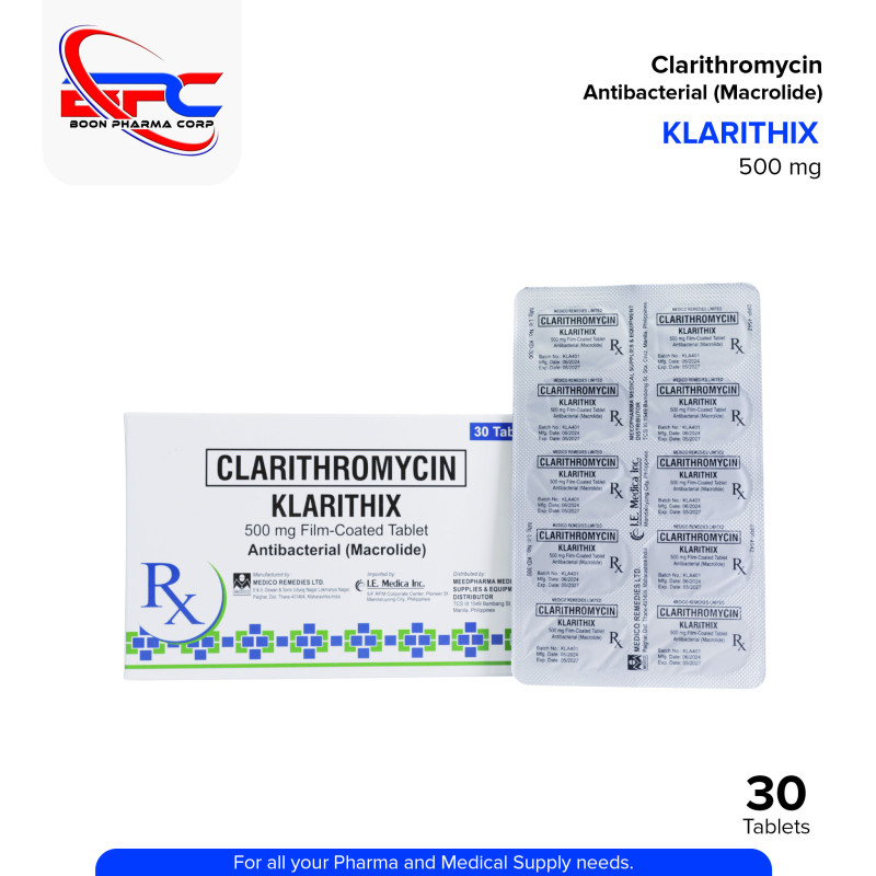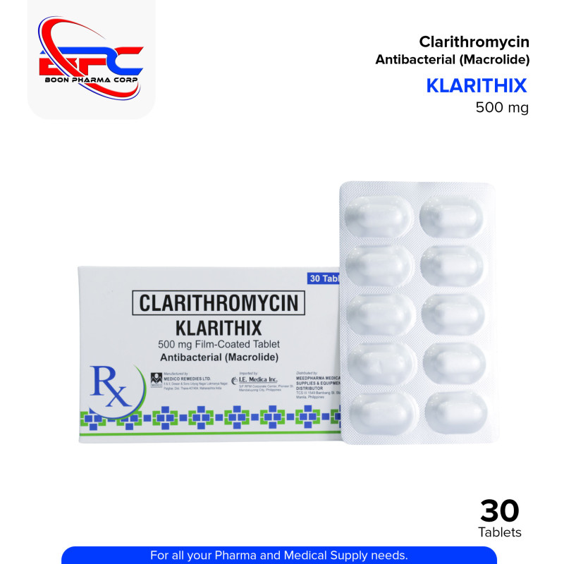 KLARITHIX (Clarithromycin) is a macrolide antibiotic used to treat various bacterial infections, including respiratory tract infections, skin infections, and Helicobacter pylori-associated ulcers. It works by inhibiting bacterial protein synthesis.