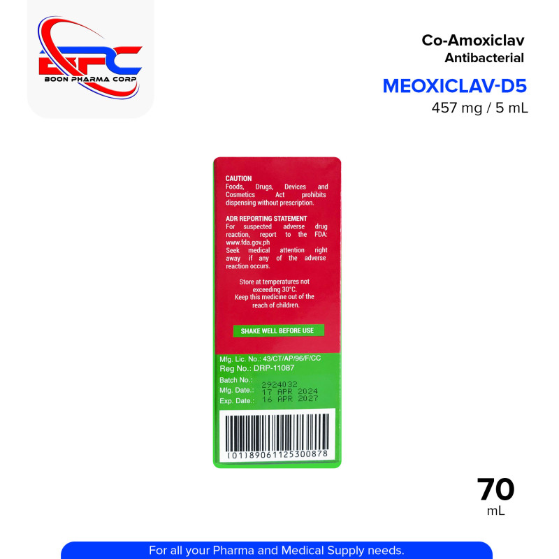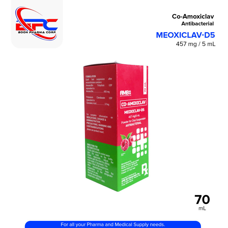 MEOXICLAV Co-Amoxiclav 457 mg / 5 mL is a broad-spectrum antibacterial powder for oral suspension. It combines Amoxicillin, a penicillin-type antibiotic, with Clavulanic Acid, a beta-lactamase inhibitor, to treat various bacterial infections including respiratory tract infections, urinary tract infections, and skin infections. Ideal for pediatric use, it offers palatable and effective treatment.