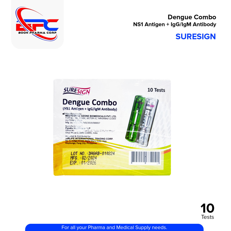 SURESIGN Dengue Combo Test Kit is a rapid diagnostic test used to help support the early detection of dengue virus infection. It detects both NS1 antigen and IgG/IgM antibodies from a small blood sample. Designed for fast and reliable results in clinical and field settings. Use only as directed by a healthcare professional.