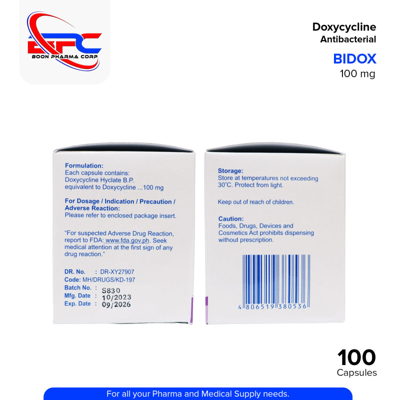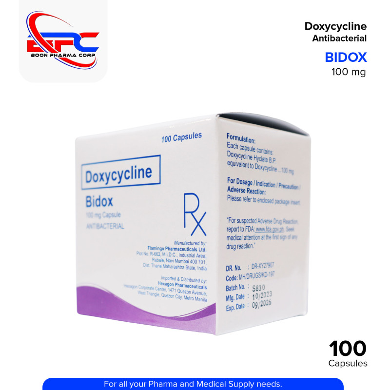 BIDOX Doxycycline 100 mg Capsule is a broad-spectrum tetracycline antibiotic used to treat a variety of bacterial infections including respiratory tract infections, urinary tract infections, skin infections, and sexually transmitted infections. It is also effective for malaria prophylaxis and treatment of atypical pathogens. Suitable for outpatient and maintenance antibiotic therapy.