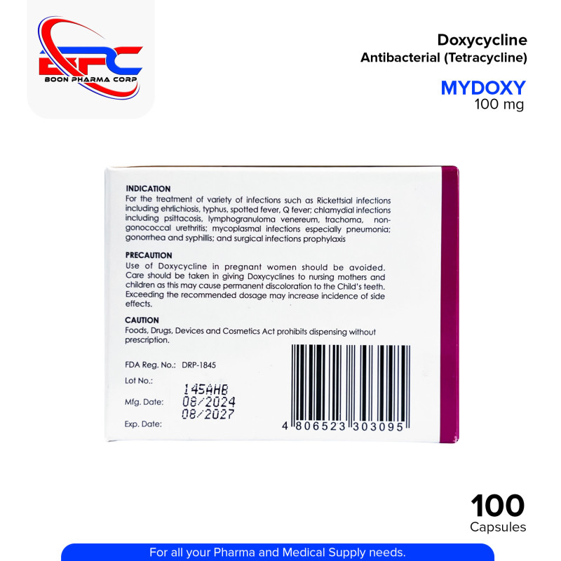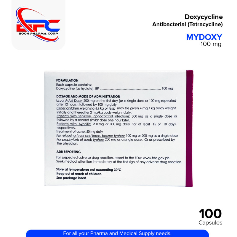 MYDOXY Doxycycline Capsule is a broad-spectrum antibacterial medication from the tetracycline class. It is used to help support the treatment of respiratory tract infections, skin infections, urinary tract infections, and certain sexually transmitted infections. Always consult your healthcare professional before use.