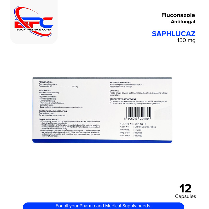 SAPHLUCAZ Fluconazole 150 mg Capsule is a systemic antifungal medication used to help support the treatment of fungal infections such as vaginal candidiasis, oral thrush, and systemic mycoses. It works by inhibiting the growth of fungal cell membranes. Best taken as prescribed by a healthcare professional.