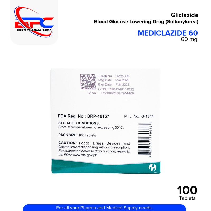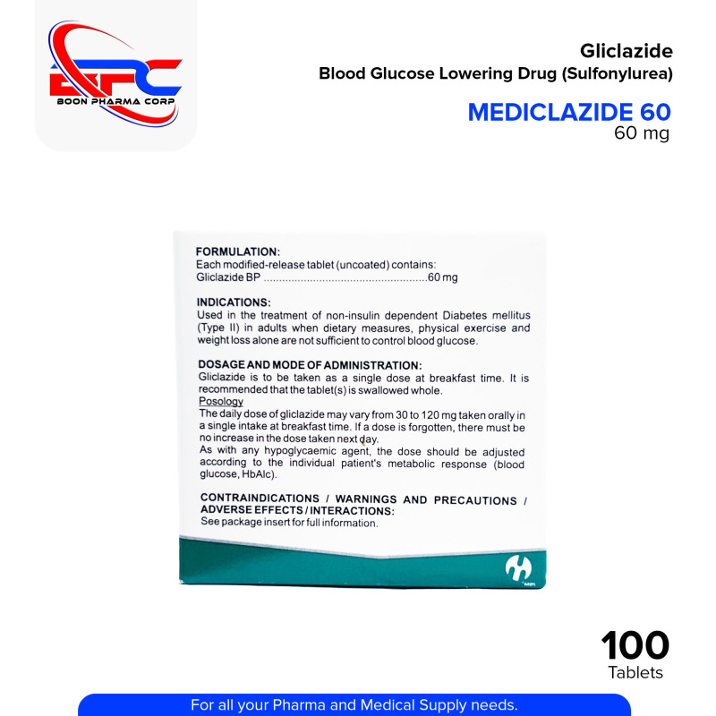 MEDICLAZIDE 60 Gliclazide Blood Glucose Lowering Drug Sulfonylurea Modified Release Tablet 100's