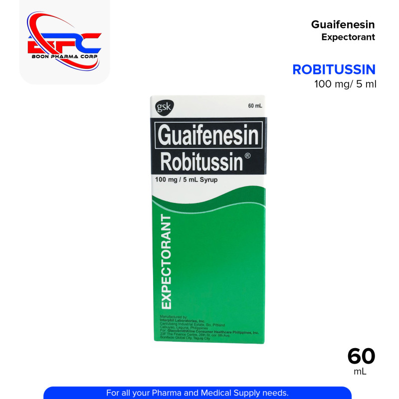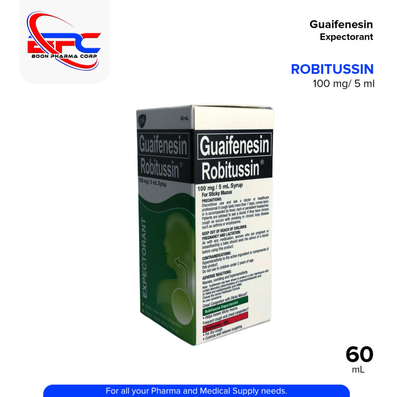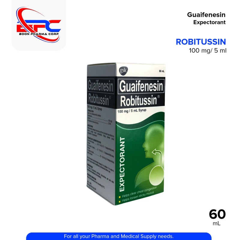 ROBITUSSIN Guaifenesin 100 mg / 5 mL Syrup is an expectorant used to relieve chest congestion by thinning and loosening mucus in the airways. It helps clear mucus from the lungs, making coughs more productive and easing breathing. Ideal for relief from colds, bronchitis, and other respiratory tract infections.