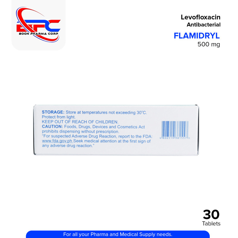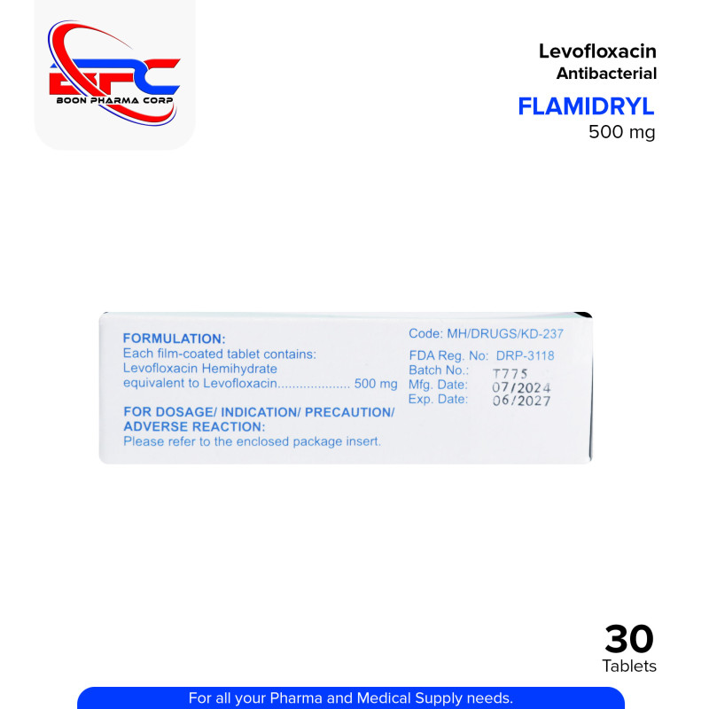 FLAMIDRYL contains Levofloxacin, a fluoroquinolone antibacterial used to treat susceptible bacterial infections of the respiratory tract, urinary tract, skin, and soft tissues. It works by inhibiting bacterial DNA replication, helping clear infection effectively when taken as prescribed.