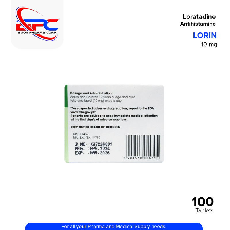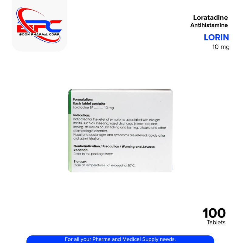 LORIN Loratadine 10 mg Tablet is a non-drowsy antihistamine used to relieve symptoms of allergic rhinitis, such as sneezing, runny nose, itchy throat, and watery eyes. It is also effective in treating skin allergies like hives and itching. LORIN provides fast, 24-hour allergy relief with minimal sedation.