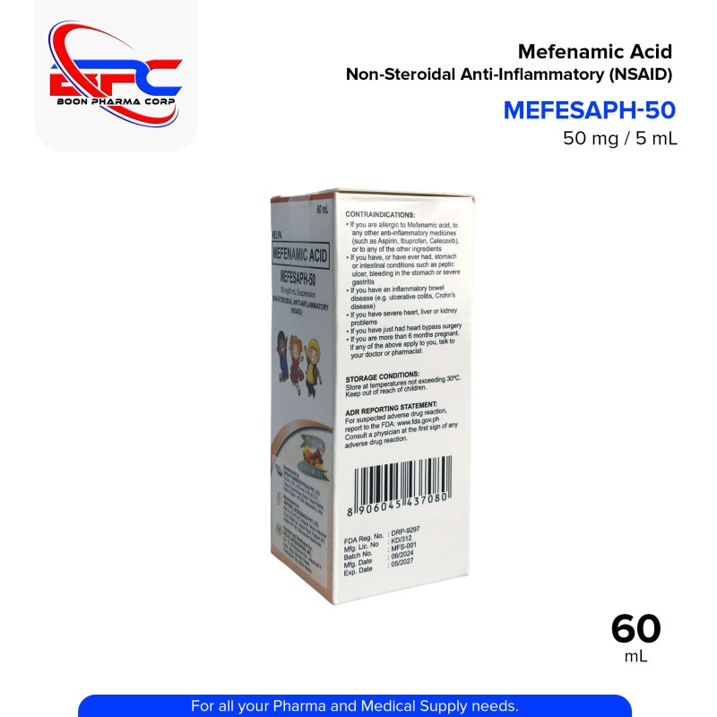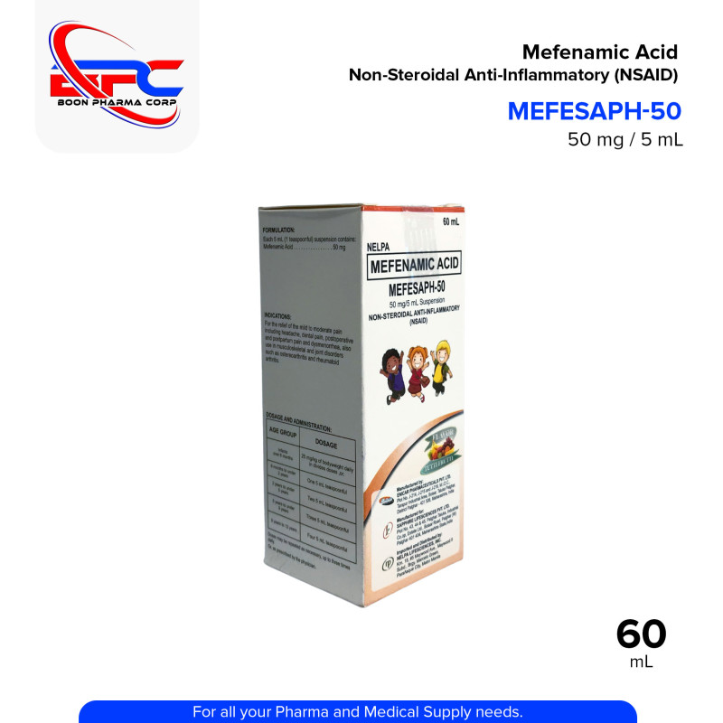 MEFESAPH-50 Mefenamic Acid Suspension 50 mg / 5 mL is a non-steroidal anti-inflammatory drug (NSAID) used to relieve mild to moderate pain and reduce fever, particularly in children. It is commonly indicated for headaches, toothaches, muscle pain, and fever. Its palatable suspension form ensures ease of administration for pediatric patients.