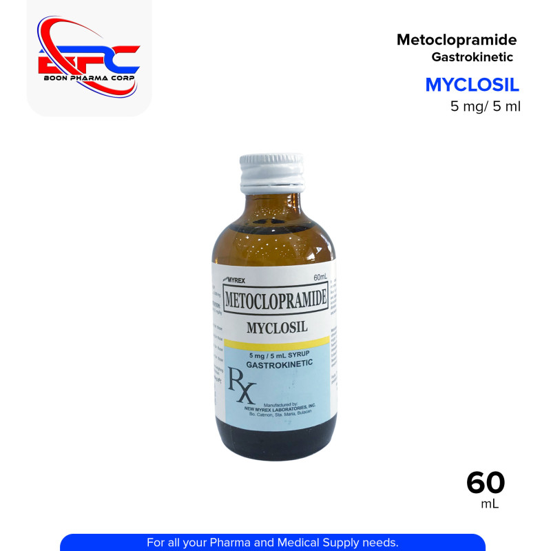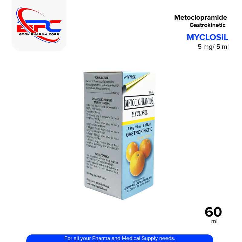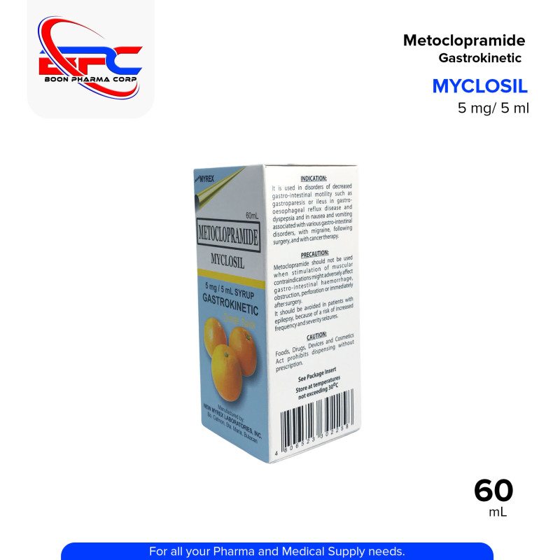 MYCLOSIL Metoclopramide 5 mg / 5 mL Syrup is a gastrokinetic agent used to treat nausea, vomiting, and delayed gastric emptying. It helps improve movement in the upper digestive tract, making it useful in managing symptoms of gastroesophageal reflux and diabetic gastroparesis. Its orange-flavored syrup formulation makes it suitable for pediatric and adult use.