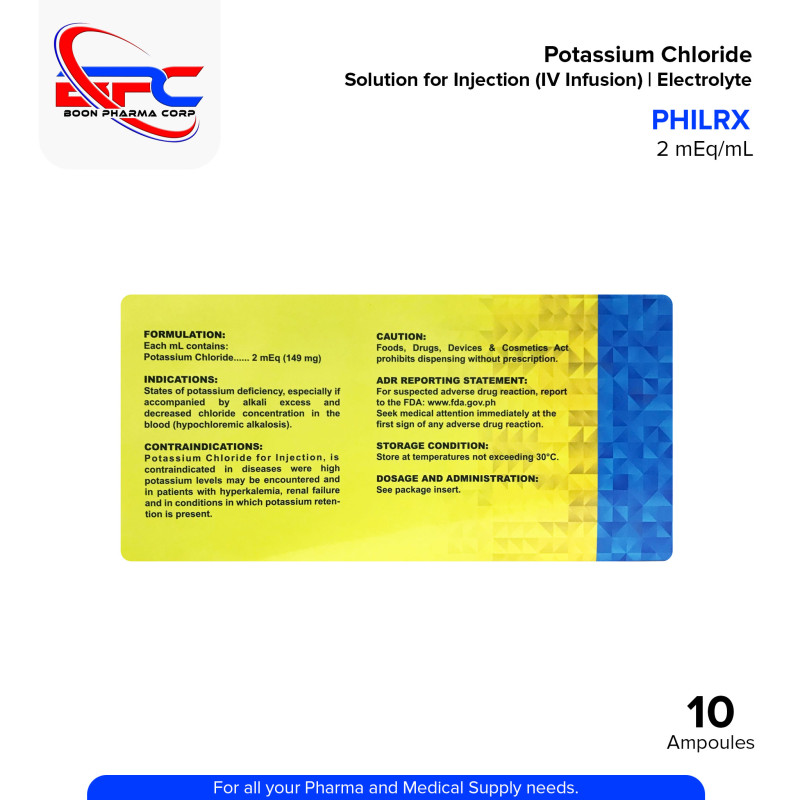 PHIL RX Potassium Chloride Injection is a sterile electrolyte solution used for intravenous infusion to help correct potassium deficiency and maintain normal electrolyte balance. It is commonly used in hospital and clinical settings for patients requiring controlled potassium supplementation under medical supervision.