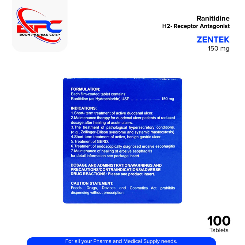 ZENTEK Ranitidine 150 mg Film-Coated Tablet is an H2 receptor antagonist used to help support the relief and prevention of acid-related gastrointestinal conditions such as heartburn, gastric ulcers, and gastroesophageal reflux disease (GERD). It works by reducing the amount of acid produced in the stomach. Use only as directed by a healthcare professional.