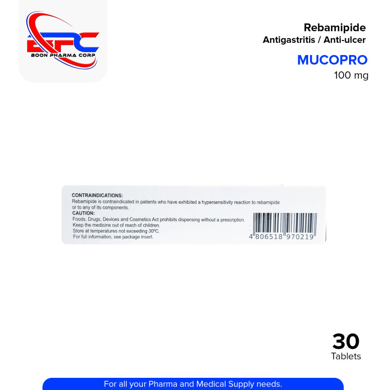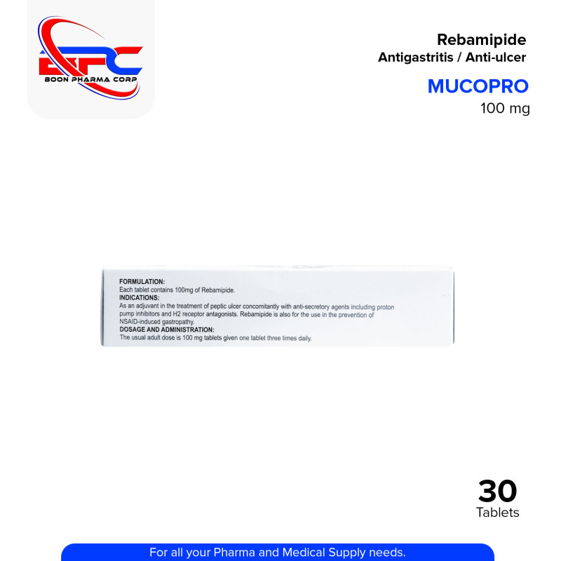 MUCOPRO Rebamipide 100 mg Tablet is an antigastritis and anti-ulcer agent used to treat and protect against gastric mucosal damage. It works by increasing the production of mucus in the stomach lining, enhancing its defense against irritants and promoting healing of ulcers and gastritis. Suitable for patients with chronic gastritis, NSAID-induced ulcers, and other gastrointestinal disorders.