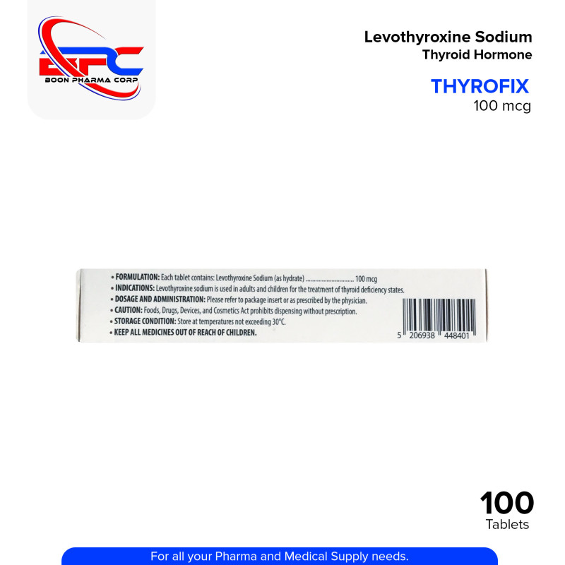 THYROFIX Levothyroxine Sodium 100 mcg Tablet is a synthetic thyroid hormone used to help support the treatment of hypothyroidism (underactive thyroid). It helps restore normal thyroid hormone levels in the body, improving metabolism, energy levels, and overall hormonal balance. Always consult your healthcare professional before use.