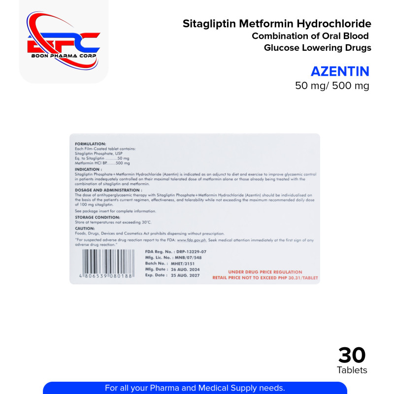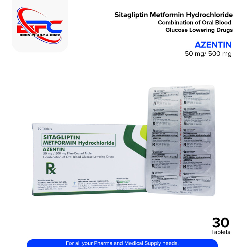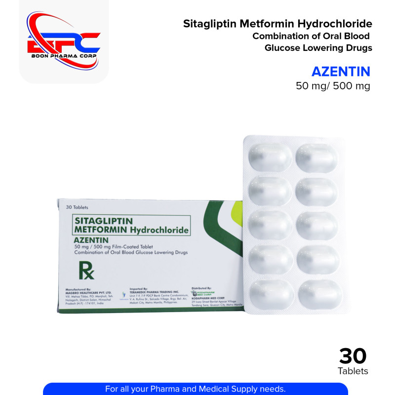 Sitagliptin Metformin Hydrochloride (Azentin) 50mg/500mg Film-Coated Tablet is a combination medication used to treat type 2 diabetes. It contains two active ingredients: Sitagliptin, which works by enhancing insulin secretion and reducing glucose production in the liver, and Metformin, which helps the body use insulin more effectively and decreases the amount of sugar produced by the liver. This medication helps lower blood sugar levels when diet and exercise alone are not enough. It is available in a 30-tablet pack.