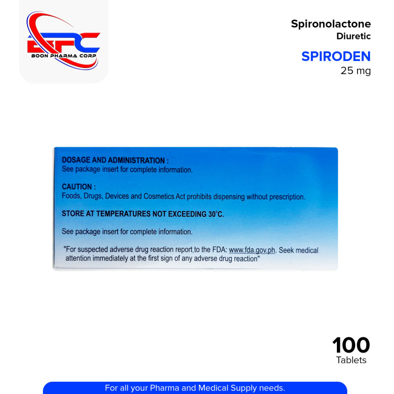 SPIRODEN (Spironolactone) is a potassium-sparing diuretic used to treat conditions such as hypertension, heart failure, edema, and certain cases of hyperaldosteronism. It works by preventing the body from absorbing too much salt and keeping potassium levels from getting too low.