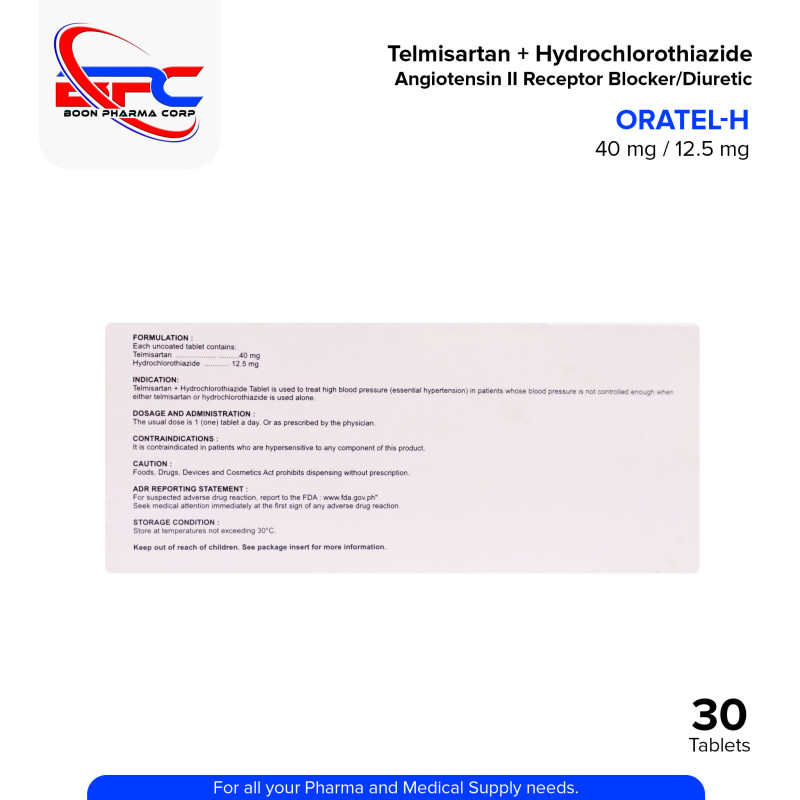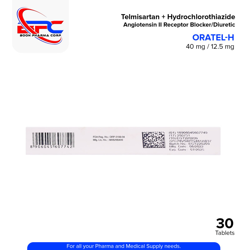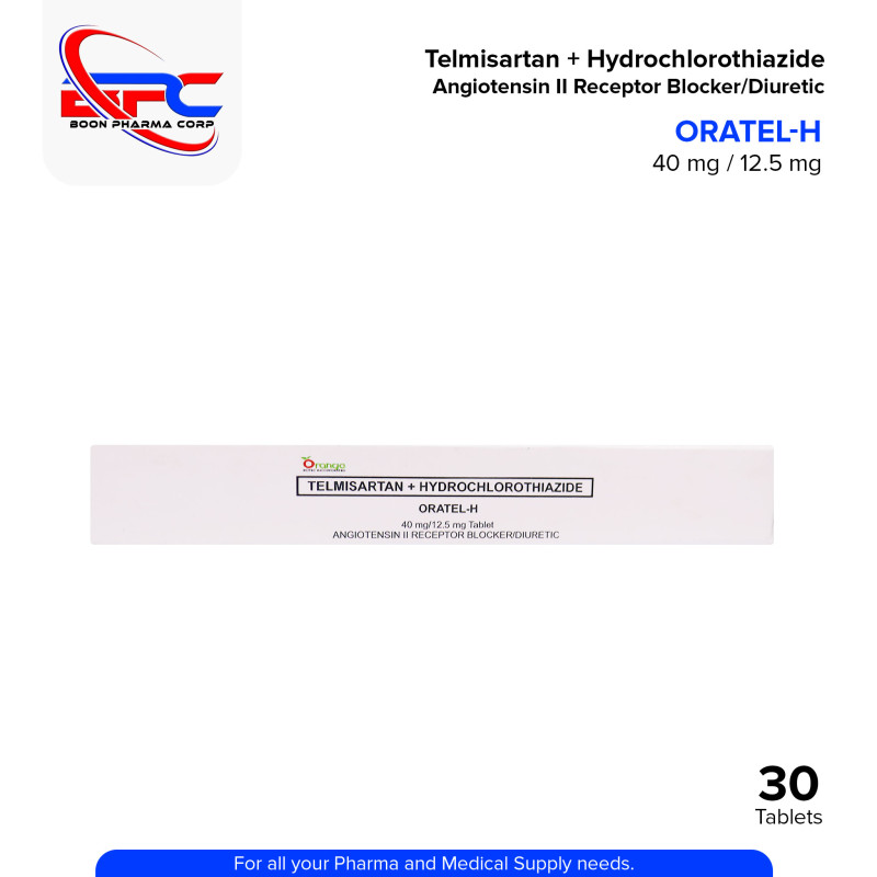 ORATEL-H combines Telmisartan (40 mg), an angiotensin II receptor blocker (ARB), with Hydrochlorothiazide (12.5 mg), a thiazide diuretic. This fixed-dose combination is indicated for the treatment of hypertension in patients who require dual therapy. It works by relaxing blood vessels and reducing excess fluid, effectively lowering blood pressure and reducing cardiovascular risk.