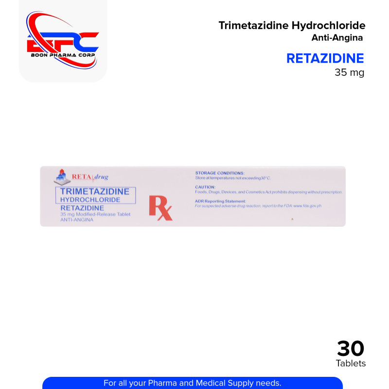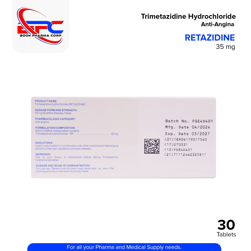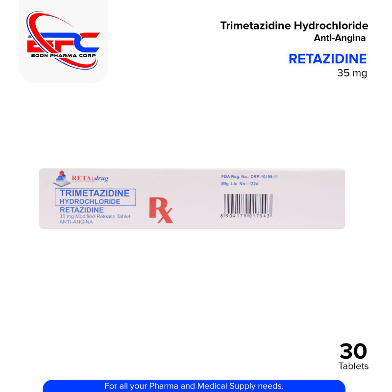 RETAZIDINE Trimetazidine Hydrochloride 35 mg Modified Release Tablet is an anti-anginal medication used in the management of stable angina pectoris. It works by improving myocardial glucose utilization through metabolic modulation, enhancing heart efficiency under ischemic conditions without affecting blood pressure or heart rate.