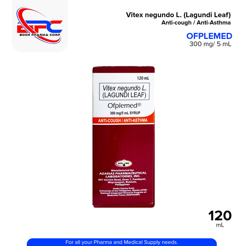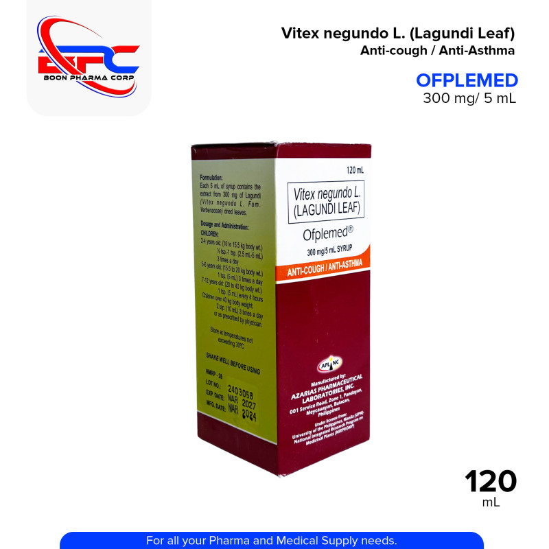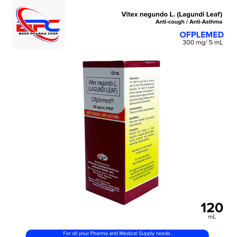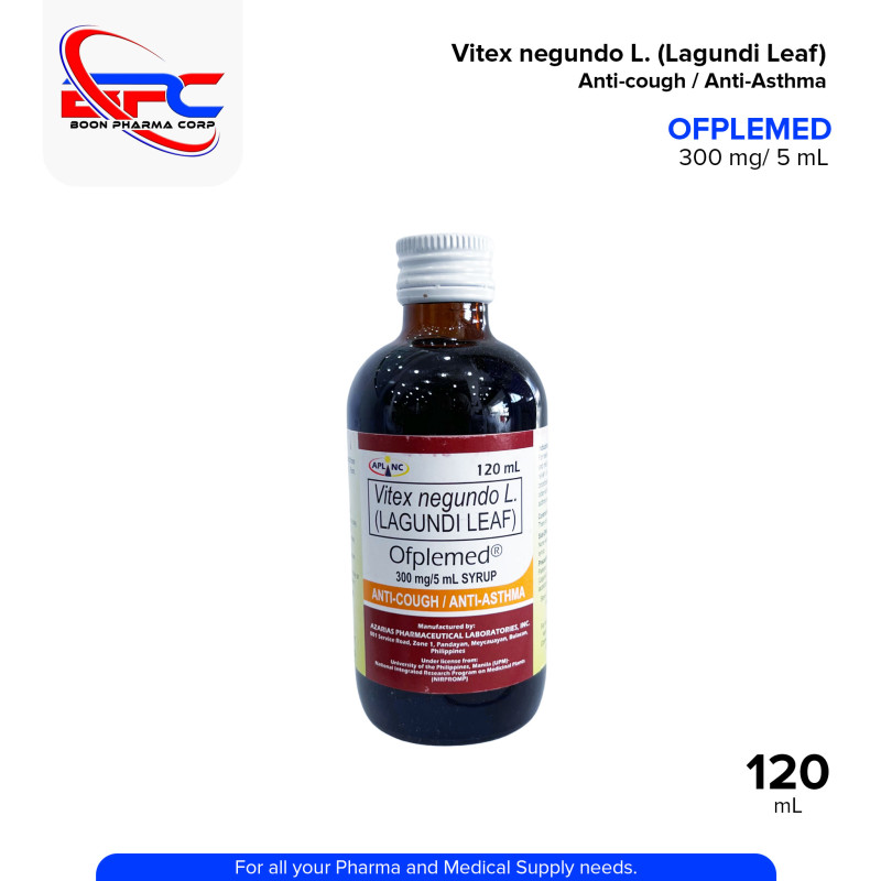 Vitex Negundo L Lagundi Leaf (Ofplemed) Orange Flavor 300mg/5ml Syrup 60ml is an herbal supplement designed to support respiratory health. This syrup contains 300mg of Lagundi (Vitex negundo) leaf extract per 5ml, known for its natural anti-inflammatory, expectorant, and antitussive properties. It is commonly used to relieve symptoms of cough, asthma, and bronchitis. The syrup comes in a pleasant orange flavor, making it easy to consume. The 60ml bottle provides an effective and convenient solution for improving respiratory function and overall wellness.
